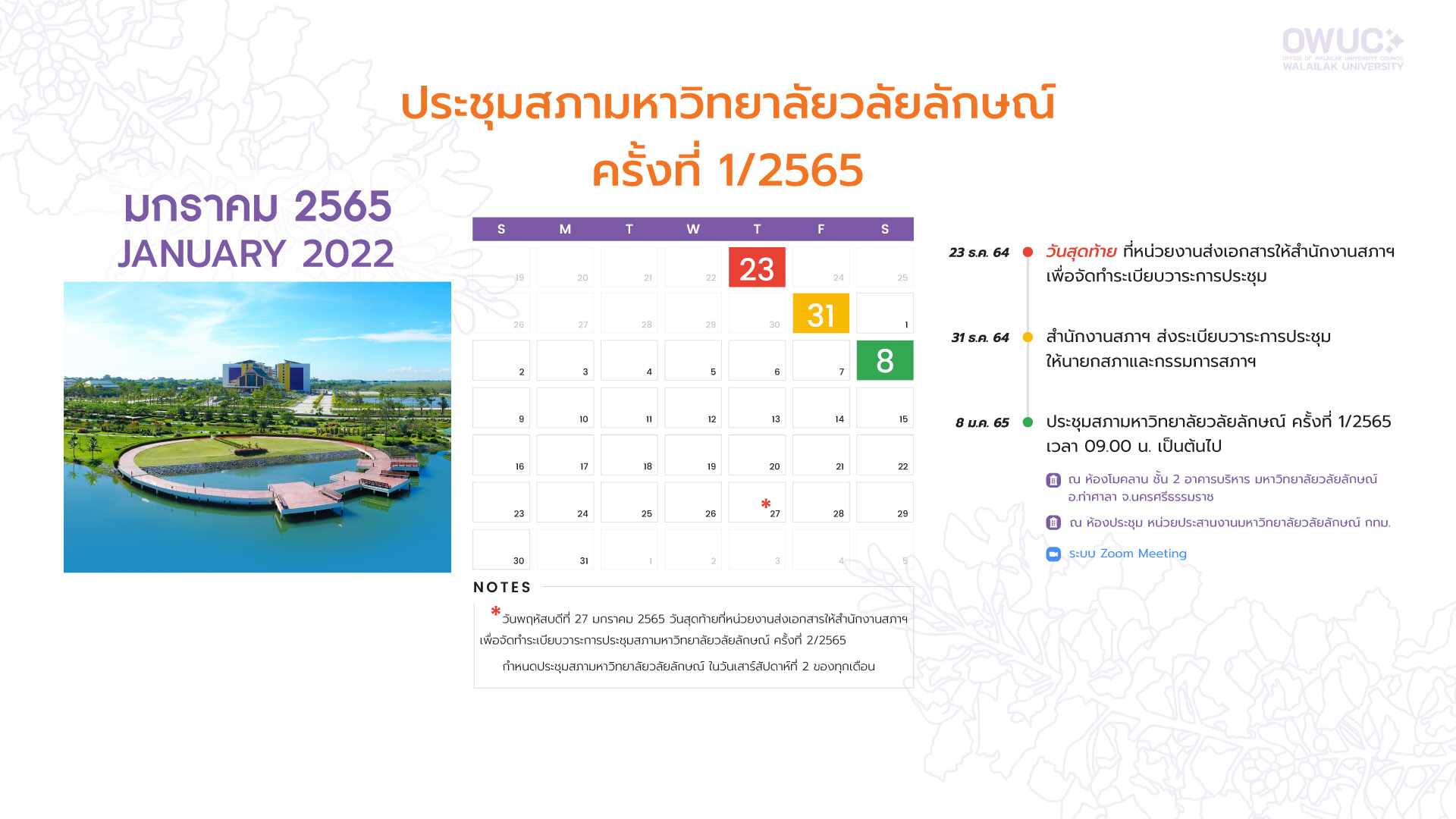 ปฏิทินประชุมสภามหาวิทยาลัยวลัยลักษณ์ ครั้งที่ 1/2565